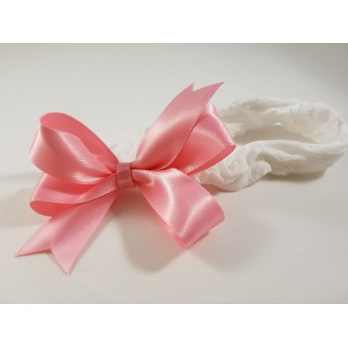 Small Satin Bows are sewn onto soft, stretchy nylon headbands. The satin bow is about 4” across and created from 7/8” ribbon. This is a loopy satin bow and is balanced but not symmetrical by design for a more whimsical style.